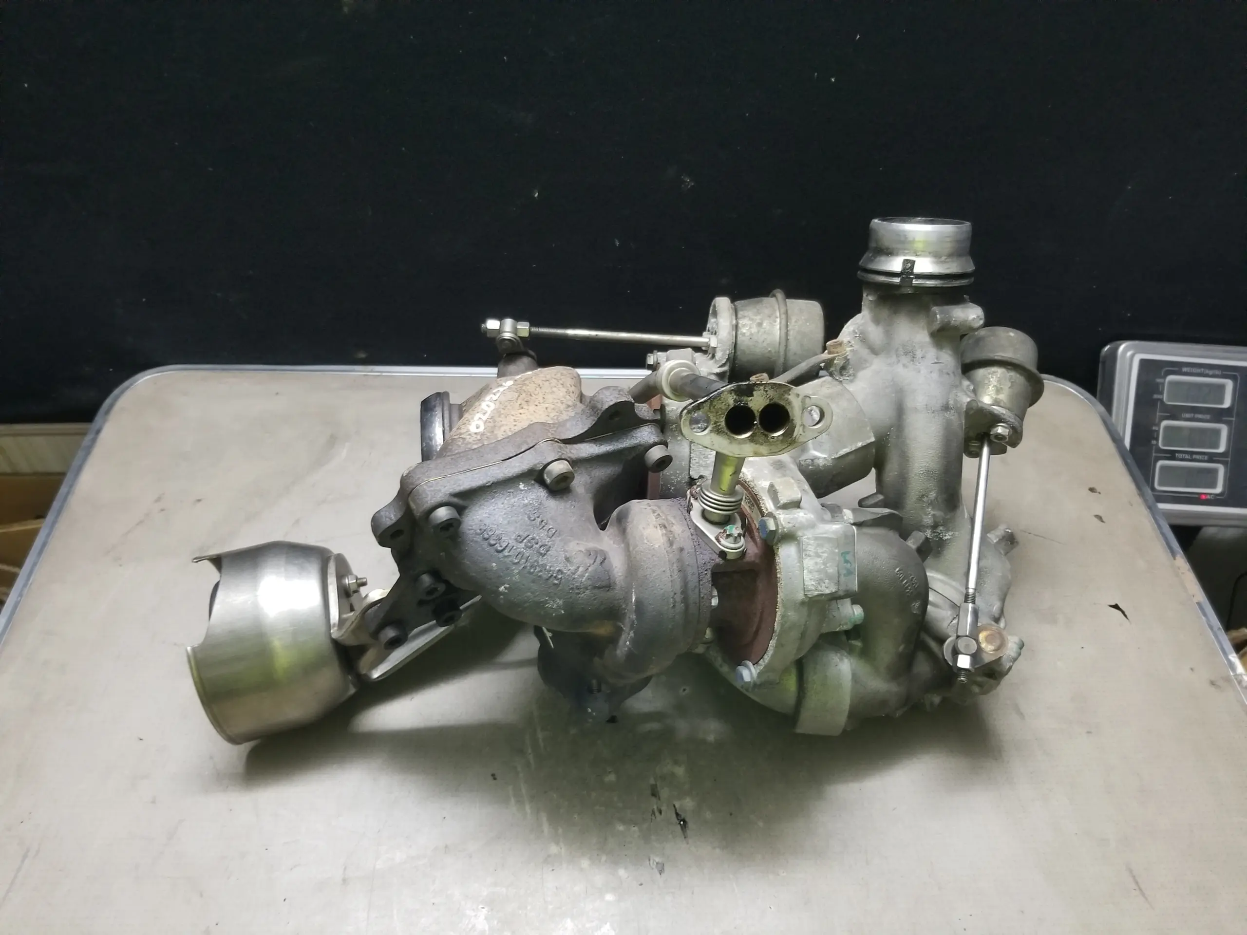Genuine used twin (sequential) turbocharger assembly removed from a